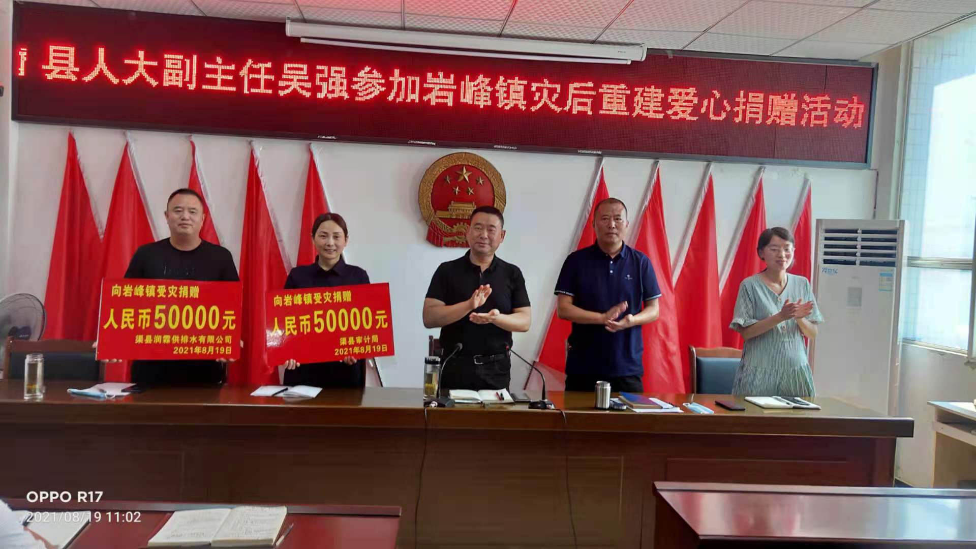 8月19日上午,渠县审计局、渠县润林供排水有限公司分别向“7.11”“8.8”两次洪灾受损严重的岩峰镇捐赠人民币各5万元。