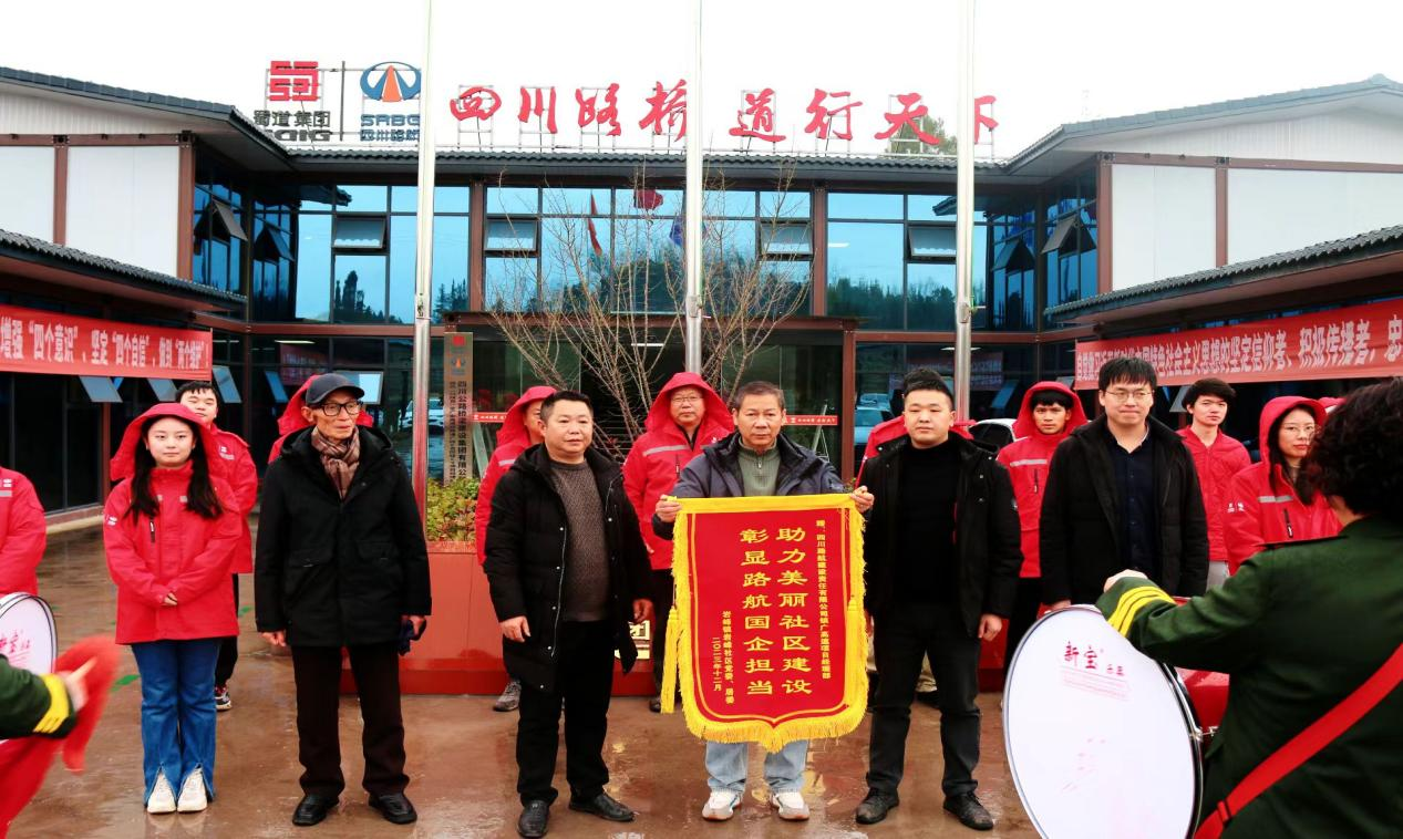 2024年1月23日下午,渠县岩峰镇党委副书记覃小武、岩峰社区党委书记杨卫东、镇老协副会长王云全及镇政府和岩峰社区干部,冒寒风顶冬雨,敲锣打鼓,为镇广高速C9项目经理部,送去一面“助力美丽社区建设,彰显路航国企担当”的锦旗,以表达岩峰人民对该项目部深深的谢意。