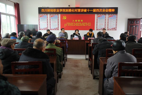 在嘉禾乡雅化村农民夜校,黄吉秀为50余名乡村干部、党员代表、群众代表等宣讲省委十一届四次全会精神。黄吉秀讲到,全会听取和讨论了彭清华代表省委常委会作的工作报告,讨论了《省委常委会2019年工作要点》。全会号召,全省各级党组织和广大党员干部要紧密团结在以习近平同志为核心的党中央周围,坚定以习近平新时代中国特色社会主义思想为指导,全面落实党的十九大精神和省委决策部署,锐意进取、埋头苦干,为推动治蜀兴川再上新台阶而努力奋斗!全会还对大力实施乡村振兴战略提出了明确要求,深入实施村容村貌“六化”工程,突出抓好农村垃圾治理、污水治理和“厕所革命”,建设一批“美丽四川·宜居乡村”达标村。黄吉秀表示,雅化村全体党员干部要认真学习和贯彻落实省委十一届四次全会精神,责任上有担当、行动上有落实,以高度政治自觉坚定践行“两个维护”,始终在思想上政治上行动上同以习近平同志为核心的党中央保持高度一致。四川财经职业学院在雅化村脱贫攻坚帮扶工作中继续履行责任担当、措施落实到位,雅化村党员干部也要有主人翁的姿态,向贫困抗争、往幸福前进。