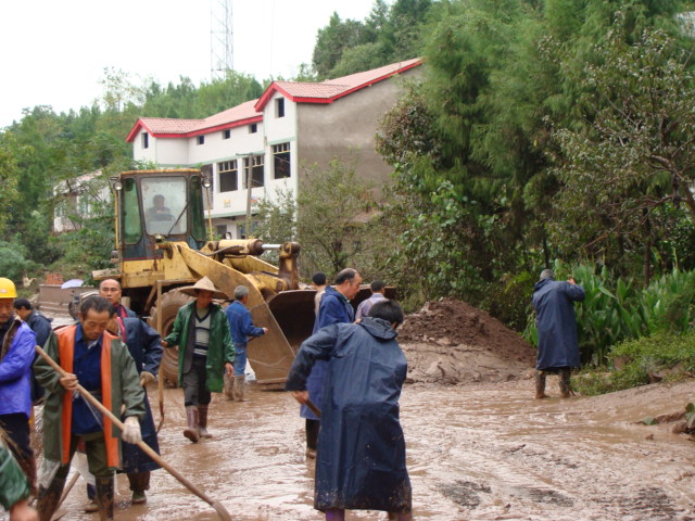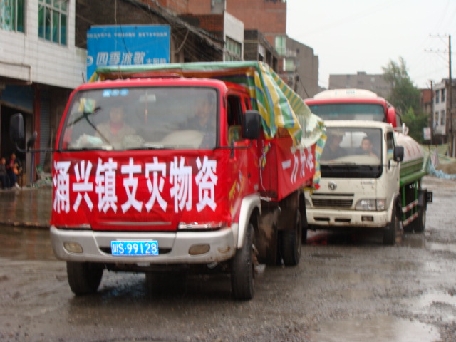 从9月18日下午开始,涌兴镇党委政府即着手储备救灾救急物资,组建招募志愿救灾队伍,随时准备驰援报恩乡。但由于水涨阻隔,无法进驻。洪水退却的9月20日上午,镇委带着近4万元的救灾物资及近百名应急队员以及铲车、洒水车等器具,开赴报恩乡开展救灾工作。他们一边将方便面、矿泉水、饼干等救灾物资分发到受灾村社,一边组织人员开展自报恩乡政府往石梯段的道路清淤工作,以方便救灾车辆能够迅捷进入灾区。应急队员们在镇党委书记李峰、镇长刘强的带领下,大家对灾区受灾景象感同深受,并化为积极为灾区尽心尽力劳作的自觉行动。他们挥揪抡帚,不辞辛劳地开展清淤工作。一直工作到中午2点半,才勉强吃了一包方便面,之后又继续战斗。持续到下午近6点,将道路淤泥进行了初次清理,对改善了灾区的通行条件起了积极作用。
