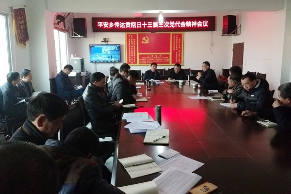 1月17日,平安乡党委召开会议,传达贯彻县十三届三次党代会精神。乡机关全体工作人员、各村支部书记、主任、文书、第一书记及乡属单位负责人参加会议。会议由乡党委书记付平恒主持。