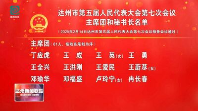 达州市第五届人民代表大会第七次会议主席团和秘书长名单 字体:大 小 打印 关闭本页 作者: 来源:达州融媒 发布时间:2025-02-15 15:33:09 点击数: 达州市第五届人民代表大会第七次会议主席团和秘书长名单2025年2月14日达州市第五届人民代表大会第七次会议预备会议通过 分享 分享到: