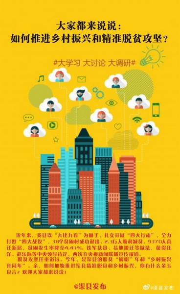 大家都来说说:如何推进乡村振兴和精准脱贫攻坚? 字体:大 小 打印 关闭本页 作者:佚名 来源:本站原创 发布时间:2018-06-05 11:12:53 点击数: 扫一扫下载渠县网APP 分享 分享到: 近年来,我县以“九比九看”为抓手,扎实开展“四大行动”,全力打好“四大战役”,38个贫困村成功退出、2.3万人顺利减贫、9370人喜迁新居,贫困发生率降至4.41%。铁军扶贫、易地搬迁等做法,获得汪洋、赵乐际等中央领导肯定,两次在央视新闻联播宣传报道。 脱贫攻坚任重道远。今年,是渠县的脱贫“摘帽”年和“乡村振兴开局年”。亲,如何加快推进渠县精准脱贫和乡村振兴,你有什么金玉良言?欢迎大家都来说说!